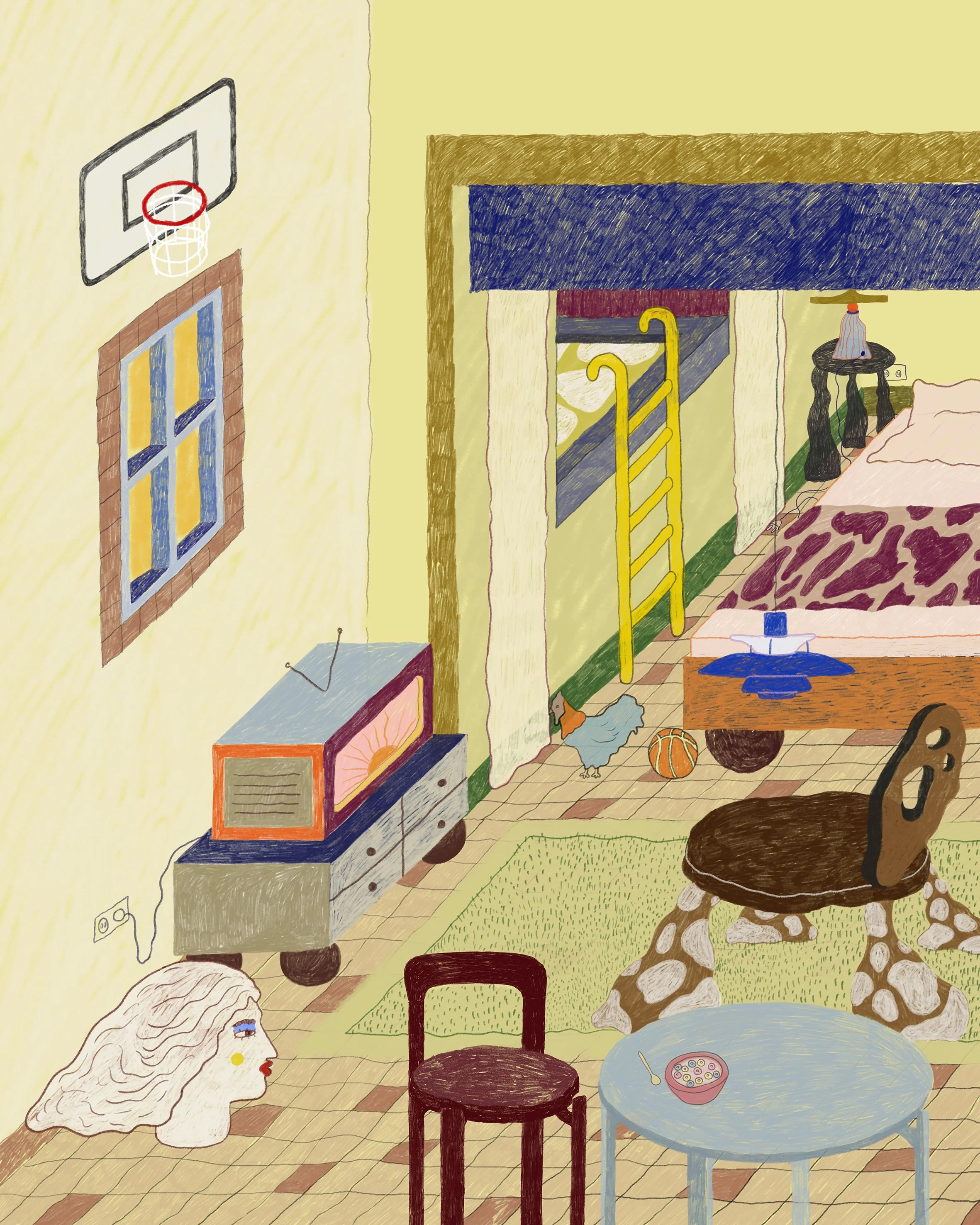 Playful, surreal spaces and objects where colour, form, and story unfold.
